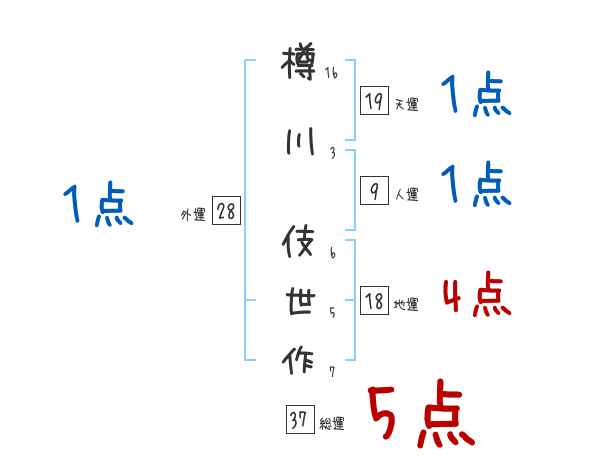 人運![]() | 樽川伎世作さんの人運は9画の1つ星!消極的で才能を発揮することが苦手なことも。周りの意見に耳を傾けましょう。 性格や才能などを表す2番目に重要な運勢です。人間関係や協調性、社会的な成功に影響します。主に20歳から50歳ぐらいまでの中年期の運勢を表します。 |