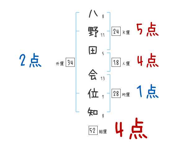 人運![]() | 八野田会位知さんの人運は18画の4つ星!情熱的で剛気。忍耐力があり信頼される。 性格や才能などを表す2番目に重要な運勢です。人間関係や協調性、社会的な成功に影響します。主に20歳から50歳ぐらいまでの中年期の運勢を表します。 |