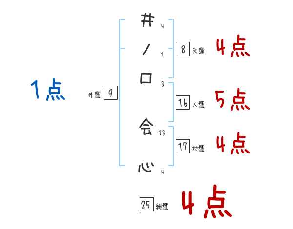 人運![]() | 井ノ口会心さんの人運は16画の5つ星!人望が厚く大きく発展する。逆転成功が見える。 性格や才能などを表す2番目に重要な運勢です。人間関係や協調性、社会的な成功に影響します。主に20歳から50歳ぐらいまでの中年期の運勢を表します。 |