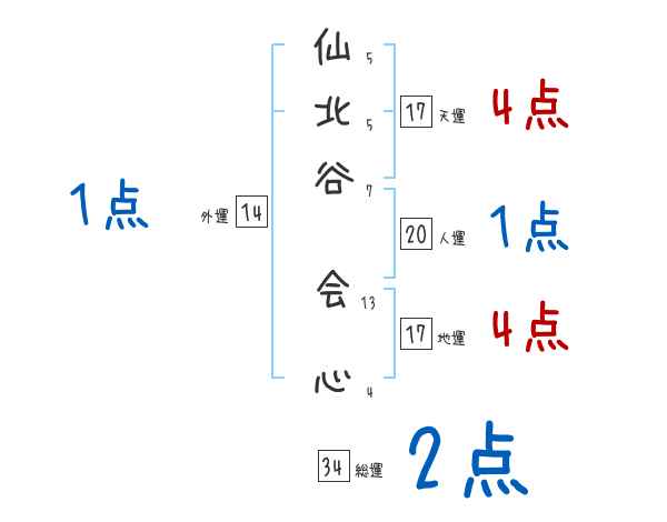 総運![]() | 仙北谷会心さんの総運は34画の2つ星!独創性に優れるが、自尊心が強く災難に注意しましょう。 あなたの人生を表す1番重要な運勢です。生涯を通じて影響する総合運となり、主に50歳以降の晩年期に影響を及ぼします。 |