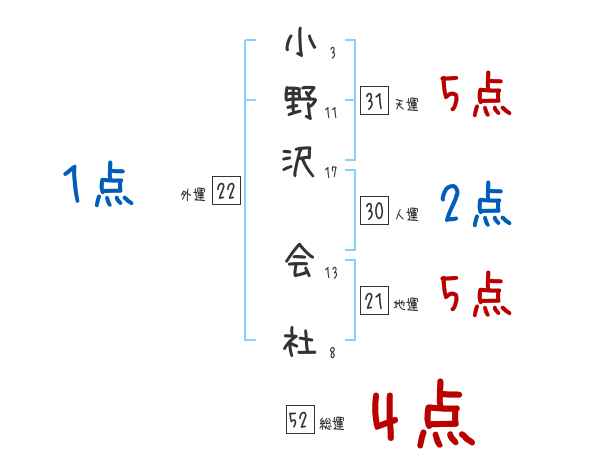 天運![]() | 小野沢会社さんの天運は31画の5つ星!社交性があり判断力に優れる。順風満帆な人生で円満な生活。 家系が持つ宿命的な運勢を表します。祖先から受け継いだ苗字ですので自分の力が及びません。家柄を象徴します。 |