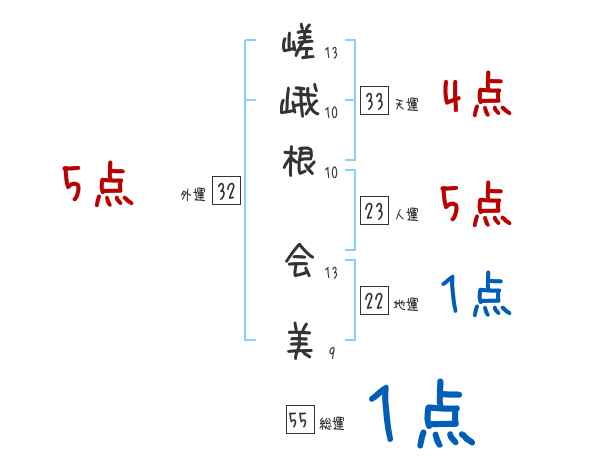 外運![]() | 嵯峨根会美さんの外運は32画の5つ星!柔軟性があり成功する。チャンスが多く金運が良い。 生活面を象徴する運勢です。外部から受ける影響力を表し、結婚運、家庭運や職場、環境への順応性を表します。 |