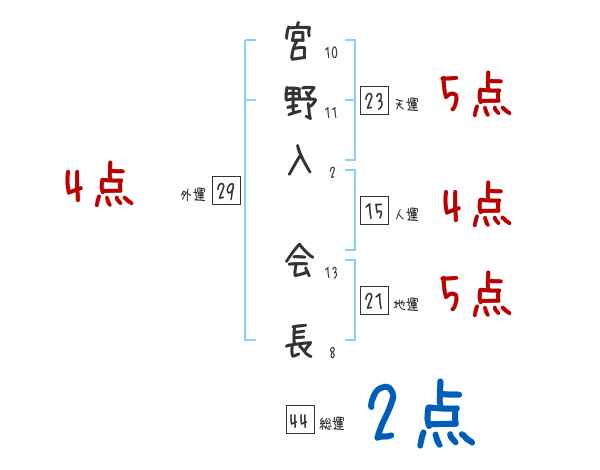 総運![]() | 宮野入会長さんの総運は44画の2つ星!誠実で慎重な性格。物事を考えすぎないように注意しましょう。 あなたの人生を表す1番重要な運勢です。生涯を通じて影響する総合運となり、主に50歳以降の晩年期に影響を及ぼします。 |