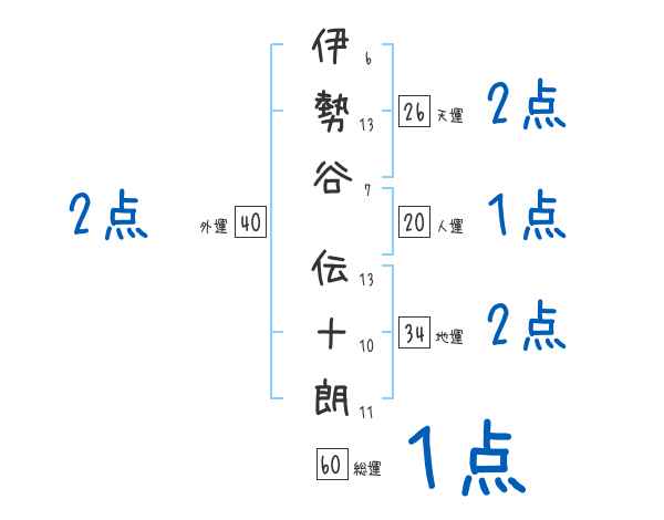 天運![]() | 伊勢谷伝十朗さんの天運は26画の2つ星!波瀾万丈かも。信頼できる人を大事にしましょう。 家系が持つ宿命的な運勢を表します。祖先から受け継いだ苗字ですので自分の力が及びません。家柄を象徴します。 |
