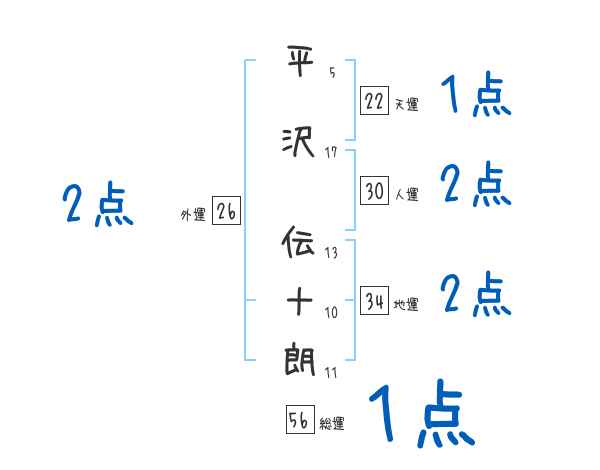 外運![]() | 平沢伝十朗さんの外運は26画の2つ星!波瀾万丈かも。信頼できる人を大事にしましょう。 生活面を象徴する運勢です。外部から受ける影響力を表し、結婚運、家庭運や職場、環境への順応性を表します。 |