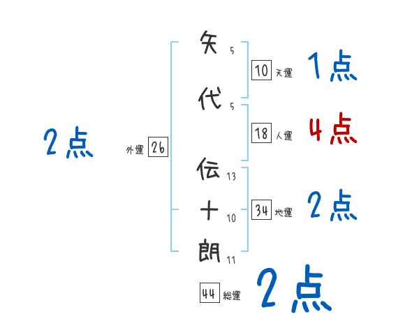 総運![]() | 矢代伝十朗さんの総運は44画の2つ星!誠実で慎重な性格。物事を考えすぎないように注意しましょう。 あなたの人生を表す1番重要な運勢です。生涯を通じて影響する総合運となり、主に50歳以降の晩年期に影響を及ぼします。 |