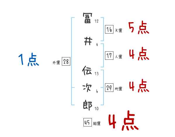 天運![]() | 冨井伝次郎さんの天運は16画の5つ星!人望が厚く大きく発展する。逆転成功が見える。 家系が持つ宿命的な運勢を表します。祖先から受け継いだ苗字ですので自分の力が及びません。家柄を象徴します。 |