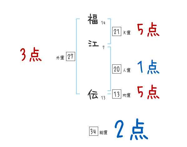 天運![]() | 福江伝さんの天運は21画の5つ星!統率力がある。独立し成功する。名誉を手に入れる。 家系が持つ宿命的な運勢を表します。祖先から受け継いだ苗字ですので自分の力が及びません。家柄を象徴します。 |