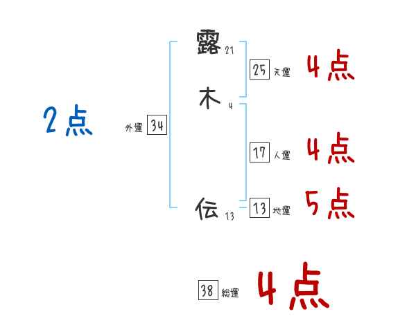 天運![]() | 露木伝さんの天運は25画の4つ星!個性があり才能があふれる。強運の持ち主で発展する。 家系が持つ宿命的な運勢を表します。祖先から受け継いだ苗字ですので自分の力が及びません。家柄を象徴します。 |