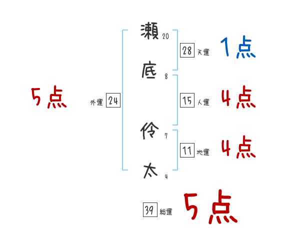 天運![]() | 瀬底伶太さんの天運は28画の1つ星!家庭環境に注意。スポーツで活躍できる能力があるかも。 家系が持つ宿命的な運勢を表します。祖先から受け継いだ苗字ですので自分の力が及びません。家柄を象徴します。 |