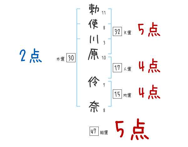 天運![]() | 勅使川原伶奈さんの天運は32画の5つ星!柔軟性があり成功する。チャンスが多く金運が良い。 家系が持つ宿命的な運勢を表します。祖先から受け継いだ苗字ですので自分の力が及びません。家柄を象徴します。 |
