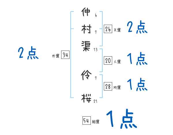 天運![]() | 仲村渠伶桜さんの天運は26画の2つ星!波瀾万丈かも。信頼できる人を大事にしましょう。 家系が持つ宿命的な運勢を表します。祖先から受け継いだ苗字ですので自分の力が及びません。家柄を象徴します。 |