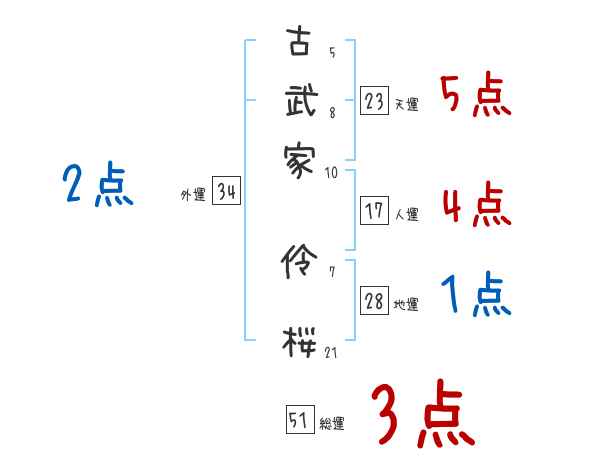 天運![]() | 古武家伶桜さんの天運は23画の5つ星!想像力に優れ活力がある。一代で成功し名誉を手に入れる。 家系が持つ宿命的な運勢を表します。祖先から受け継いだ苗字ですので自分の力が及びません。家柄を象徴します。 |