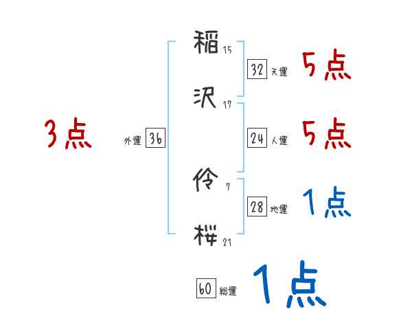 天運![]() | 稲沢伶桜さんの天運は32画の5つ星!柔軟性があり成功する。チャンスが多く金運が良い。 家系が持つ宿命的な運勢を表します。祖先から受け継いだ苗字ですので自分の力が及びません。家柄を象徴します。 |
