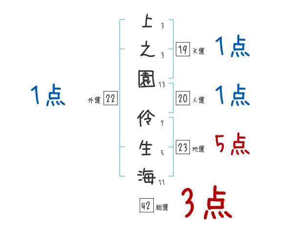 外運![]() | 上之園伶生海さんの外運は22画の1つ星!努力することが苦手ないっぽう手先が器用。芸術性にも優れる。 生活面を象徴する運勢です。外部から受ける影響力を表し、結婚運、家庭運や職場、環境への順応性を表します。 |