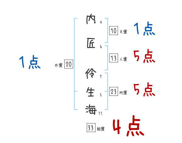 天運![]() | 内匠伶生海さんの天運は10画の1つ星!不安を感じやすい傾向。ストレスを抱えないように注意しましょう。 家系が持つ宿命的な運勢を表します。祖先から受け継いだ苗字ですので自分の力が及びません。家柄を象徴します。 |