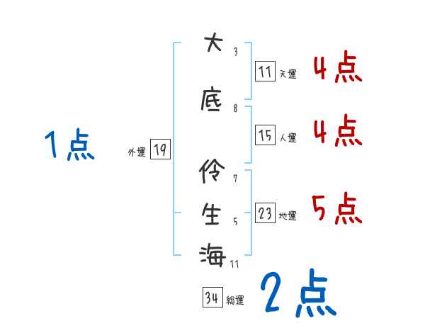 天運![]() | 大底伶生海さんの天運は11画の4つ星!着実に富や地位を得る幸運な人生。 家系が持つ宿命的な運勢を表します。祖先から受け継いだ苗字ですので自分の力が及びません。家柄を象徴します。 |