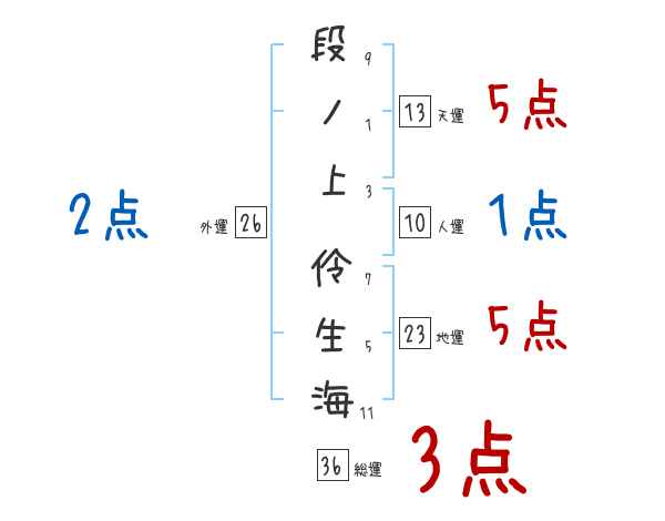 外運![]() | 段ノ上伶生海さんの外運は26画の2つ星!波瀾万丈かも。信頼できる人を大事にしましょう。 生活面を象徴する運勢です。外部から受ける影響力を表し、結婚運、家庭運や職場、環境への順応性を表します。 |