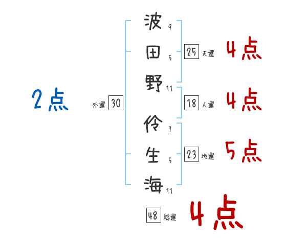総運![]() | 波田野伶生海さんの総運は48画の4つ星!賢明な性格で人望が厚い。指導力があり多くの人に尊敬される。 あなたの人生を表す1番重要な運勢です。生涯を通じて影響する総合運となり、主に50歳以降の晩年期に影響を及ぼします。 |