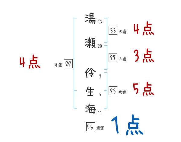 外運![]() | 湯瀬伶生海さんの外運は29画の4つ星!完全主義で才能がある。厳格な心の持ち主。 生活面を象徴する運勢です。外部から受ける影響力を表し、結婚運、家庭運や職場、環境への順応性を表します。 |