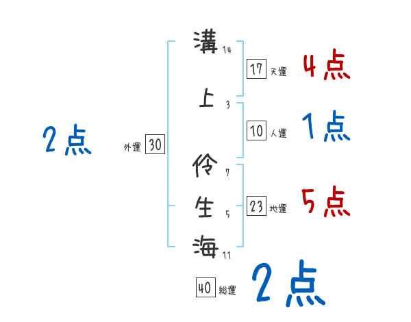 | 地運  | 溝上伶生海さんの地運は23画の5つ星!想像力に優れ活力がある。一代で成功し名誉を手に入れる。個性を表す基礎的な運勢です。性格形成や対人関係、行動力など家庭環境に影響されます。主に誕生してから20歳くらいまでの若年期の運勢を表します。 |