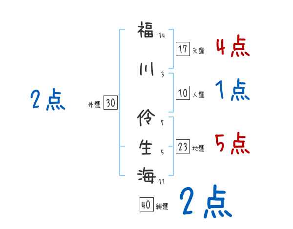 人運![]() | 福川伶生海さんの人運は10画の1つ星!不安を感じやすい傾向。ストレスを抱えないように注意しましょう。 性格や才能などを表す2番目に重要な運勢です。人間関係や協調性、社会的な成功に影響します。主に20歳から50歳ぐらいまでの中年期の運勢を表します。 |