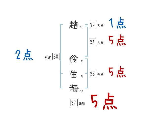人運![]() | 趙伶生海さんの人運は21画の5つ星!統率力がある。独立し成功する。名誉を手に入れる。 性格や才能などを表す2番目に重要な運勢です。人間関係や協調性、社会的な成功に影響します。主に20歳から50歳ぐらいまでの中年期の運勢を表します。 |