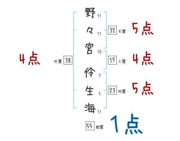 天運![]() | 野々宮伶生海さんの天運は32画の5つ星!柔軟性があり成功する。チャンスが多く金運が良い。 家系が持つ宿命的な運勢を表します。祖先から受け継いだ苗字ですので自分の力が及びません。家柄を象徴します。 |