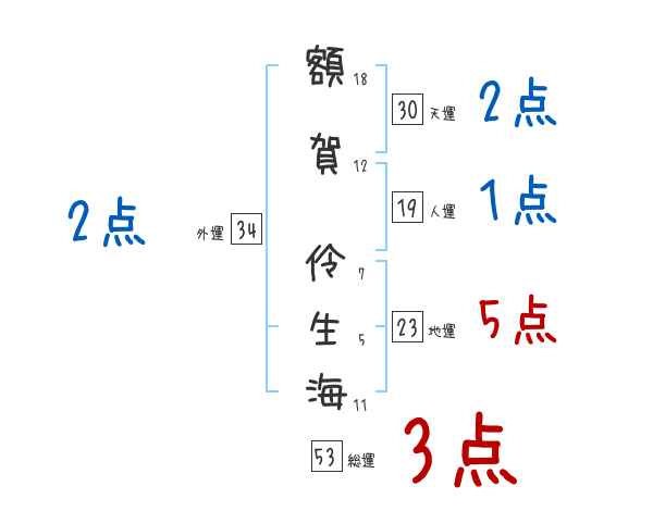 外運![]() | 額賀伶生海さんの外運は34画の2つ星!独創性に優れるが、自尊心が強く災難に注意しましょう。 生活面を象徴する運勢です。外部から受ける影響力を表し、結婚運、家庭運や職場、環境への順応性を表します。 |
