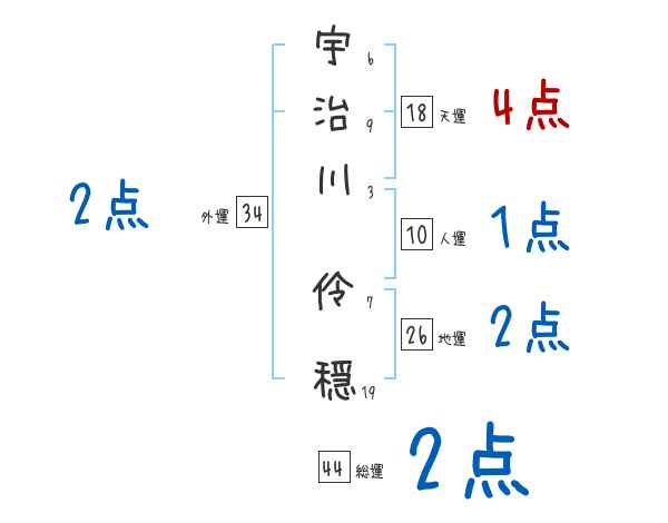 総運![]() | 宇治川伶穏さんの総運は44画の2つ星!誠実で慎重な性格。物事を考えすぎないように注意しましょう。 あなたの人生を表す1番重要な運勢です。生涯を通じて影響する総合運となり、主に50歳以降の晩年期に影響を及ぼします。 |