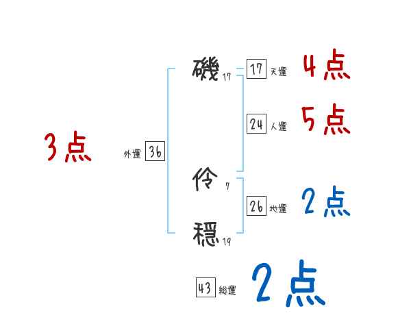 外運![]() | 磯伶穏さんの外運は36画の3つ星!先見性が豊かです。多少神経質で苦労することも。 生活面を象徴する運勢です。外部から受ける影響力を表し、結婚運、家庭運や職場、環境への順応性を表します。 |
