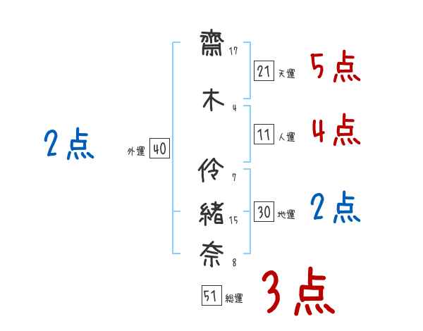 天運![]() | 齋木伶緒奈さんの天運は21画の5つ星!統率力がある。独立し成功する。名誉を手に入れる。 家系が持つ宿命的な運勢を表します。祖先から受け継いだ苗字ですので自分の力が及びません。家柄を象徴します。 |