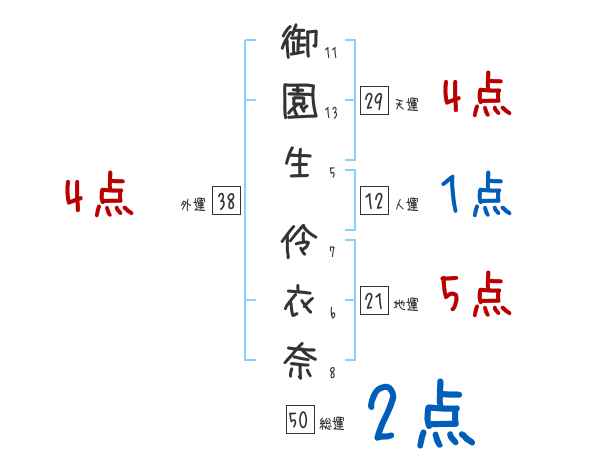 外運![]() | 御園生伶衣奈さんの外運は38画の4つ星!温厚な性格で技術的な才能を発揮する。職人的な仕事に向いている。 生活面を象徴する運勢です。外部から受ける影響力を表し、結婚運、家庭運や職場、環境への順応性を表します。 |