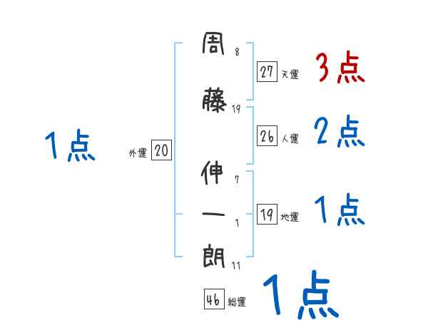人運![]() | 周藤伸一朗さんの人運は26画の2つ星!波瀾万丈かも。信頼できる人を大事にしましょう。 性格や才能などを表す2番目に重要な運勢です。人間関係や協調性、社会的な成功に影響します。主に20歳から50歳ぐらいまでの中年期の運勢を表します。 |