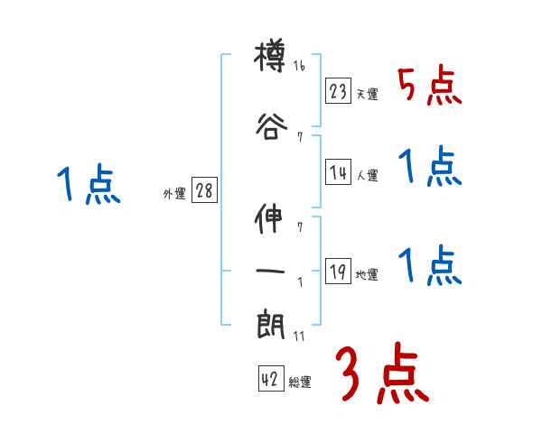 天運![]() | 樽谷伸一朗さんの天運は23画の5つ星!想像力に優れ活力がある。一代で成功し名誉を手に入れる。 家系が持つ宿命的な運勢を表します。祖先から受け継いだ苗字ですので自分の力が及びません。家柄を象徴します。 |