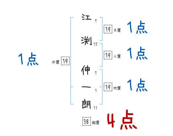 外運![]() | 江渕伸一朗さんの外運は19画の1つ星!優れた才能を持ちますが、協調性が足りないことも。周りの人と協力する事を意識しましょう。 生活面を象徴する運勢です。外部から受ける影響力を表し、結婚運、家庭運や職場、環境への順応性を表します。 |