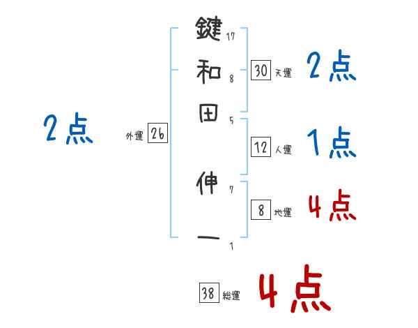 外運![]() | 鍵和田伸一さんの外運は26画の2つ星!波瀾万丈かも。信頼できる人を大事にしましょう。 生活面を象徴する運勢です。外部から受ける影響力を表し、結婚運、家庭運や職場、環境への順応性を表します。 |
