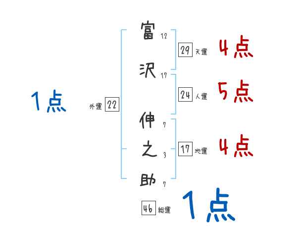 外運![]() | 富沢伸之助さんの外運は22画の1つ星!努力することが苦手ないっぽう手先が器用。芸術性にも優れる。 生活面を象徴する運勢です。外部から受ける影響力を表し、結婚運、家庭運や職場、環境への順応性を表します。 |