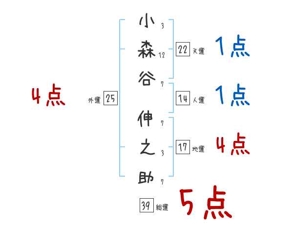 天運![]() | 小森谷伸之助さんの天運は22画の1つ星!努力することが苦手ないっぽう手先が器用。芸術性にも優れる。 家系が持つ宿命的な運勢を表します。祖先から受け継いだ苗字ですので自分の力が及びません。家柄を象徴します。 |