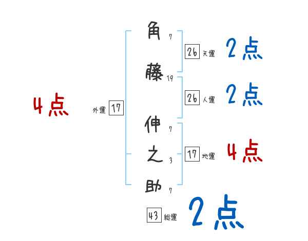 外運![]() | 角藤伸之助さんの外運は17画の4つ星!積極的な行動力。地位を気づき財産を手に入れる。純粋な心と直感力。 生活面を象徴する運勢です。外部から受ける影響力を表し、結婚運、家庭運や職場、環境への順応性を表します。 |