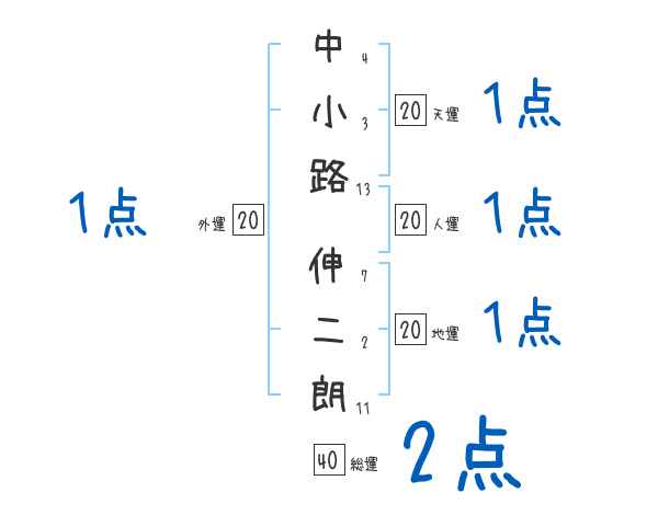 総運![]() | 中小路伸二朗さんの総運は40画の2つ星!自信過剰で物事に固執するためトラブルに注意。 あなたの人生を表す1番重要な運勢です。生涯を通じて影響する総合運となり、主に50歳以降の晩年期に影響を及ぼします。 |