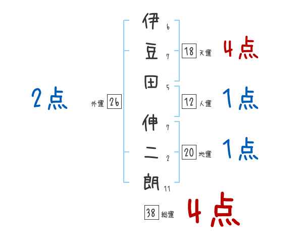 天運![]() | 伊豆田伸二朗さんの天運は18画の4つ星!情熱的で剛気。忍耐力があり信頼される。 家系が持つ宿命的な運勢を表します。祖先から受け継いだ苗字ですので自分の力が及びません。家柄を象徴します。 |