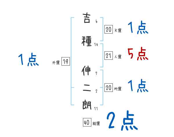 外運![]() | 吉種伸二朗さんの外運は19画の1つ星!優れた才能を持ちますが、協調性が足りないことも。周りの人と協力する事を意識しましょう。 生活面を象徴する運勢です。外部から受ける影響力を表し、結婚運、家庭運や職場、環境への順応性を表します。 |