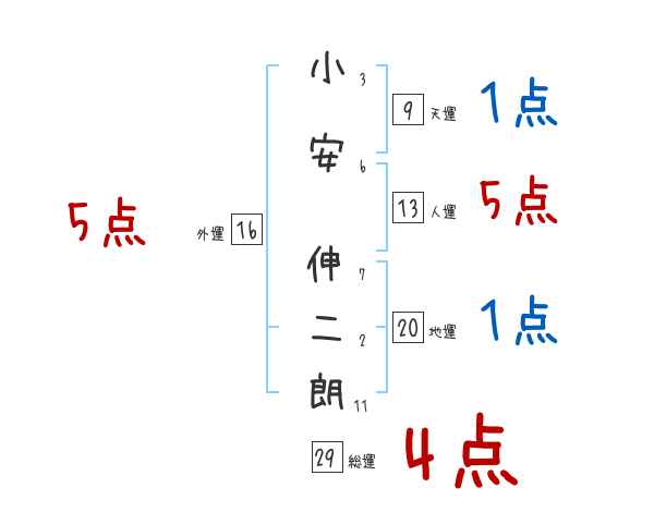 天運![]() | 小安伸二朗さんの天運は9画の1つ星!消極的で才能を発揮することが苦手なことも。周りの意見に耳を傾けましょう。 家系が持つ宿命的な運勢を表します。祖先から受け継いだ苗字ですので自分の力が及びません。家柄を象徴します。 |
