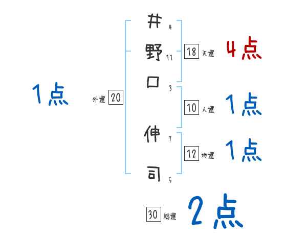 天運![]() | 井野口伸司さんの天運は18画の4つ星!情熱的で剛気。忍耐力があり信頼される。 家系が持つ宿命的な運勢を表します。祖先から受け継いだ苗字ですので自分の力が及びません。家柄を象徴します。 |