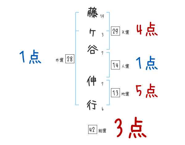 外運![]() | 藤ヶ谷伸行さんの外運は28画の1つ星!家庭環境に注意。スポーツで活躍できる能力があるかも。 生活面を象徴する運勢です。外部から受ける影響力を表し、結婚運、家庭運や職場、環境への順応性を表します。 |