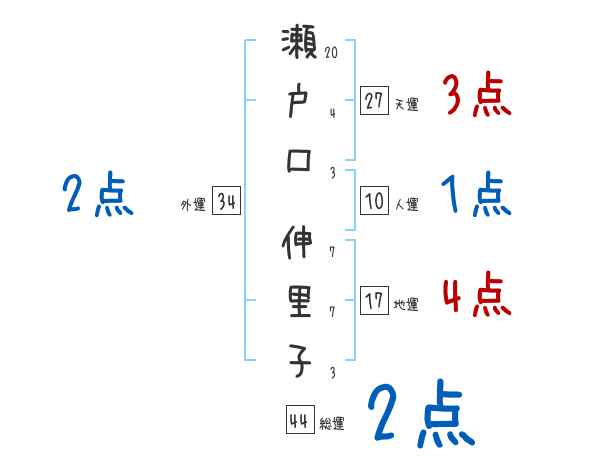 総運![]() | 瀬戸口伸里子さんの総運は44画の2つ星!誠実で慎重な性格。物事を考えすぎないように注意しましょう。 あなたの人生を表す1番重要な運勢です。生涯を通じて影響する総合運となり、主に50歳以降の晩年期に影響を及ぼします。 |