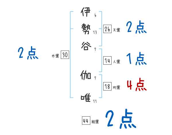 総運![]() | 伊勢谷伽唯さんの総運は44画の2つ星!誠実で慎重な性格。物事を考えすぎないように注意しましょう。 あなたの人生を表す1番重要な運勢です。生涯を通じて影響する総合運となり、主に50歳以降の晩年期に影響を及ぼします。 |