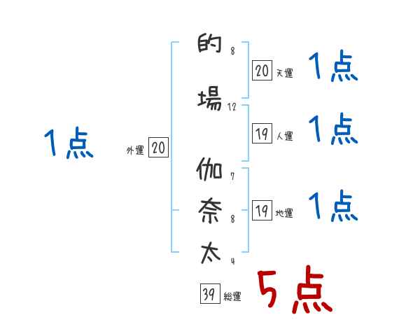 総運![]() | 的場伽奈太さんの総運は39画の5つ星!社交性に優れ人望が厚い。人の上に立ち成功する。 あなたの人生を表す1番重要な運勢です。生涯を通じて影響する総合運となり、主に50歳以降の晩年期に影響を及ぼします。 |