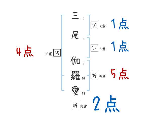 三尾伽羅愛さんの画数の鑑定結果